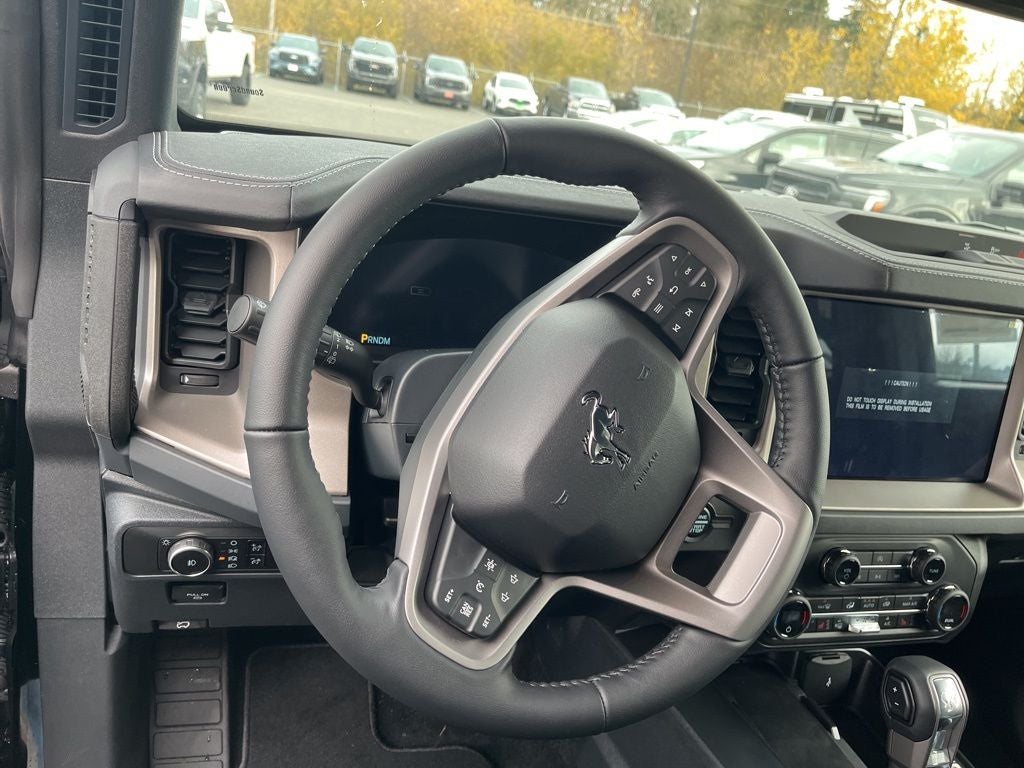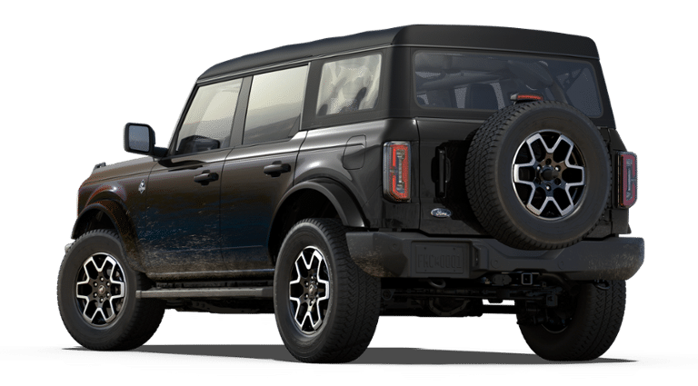 This 2025 Ford Bronco comes equipped with, 3.73 Axle Ratio, Auto High-beam Headlights, Auto-dimming Rear-View mirror, Brake assist, Connected Navigation, Electronic Stability Control, Equipment Group 312A Mid Package, Exterior Parking Camera Rear, First Aid Kit, Hard Top Sound Deadening Headliner, Heated Leather-Trimmed/Vinyl Bucket Seats, Heated steering wheel, Illuminated entry, Navigation system: Connected Navigation, Painted Hard Top, Power driver seat, Rear-Window Defroster & Washer, Shadow Black-Painted Hard Top, SYNC 4, Trailer Tow Package (DIO), 18 Bright Machined Aluminum Wheels, 4-Wheel Disc Brakes, 7 Speakers, ABS brakes, Air Conditioning, Alloy wheels, AM/FM radio: SiriusXM with 360L, AM/FM Stereo, Automatic temperature control, Compass, Delay-off headlights, Driver door bin, Driver vanity mirror, Dual front impact airbags, Dual front side impact airbags, Emergency communication system: 911 Assist, Front anti-roll bar, Front Bucket Seats, Front Center Armrest, Front dual zone A/C, Front fog lights, Front License Plate Bracket, Front reading lights, Front wheel independent suspension, Fully automatic headlights, Heated door mirrors, Heated front seats, Integrated roll-over protection, Leather Shift Knob, Low tire pressure warning, Occupant sensing airbag, Outside temperature display, Overhead airbag, Overhead console, Panic alarm, Passenger door bin, Passenger vanity mirror, Power door mirrors, Power passenger seat, Power steering, Power windows, Radio data system, Rear seat center armrest, Remote keyless entry, Security system, SiriusXM w/360L, Speed control, Split folding rear seat, Steering wheel mounted audio controls, Tachometer, Telescoping steering wheel, Tilt steering wheel, Traction control, Trip computer, Variably intermittent wipers, Voltmeter, 3.73 Axle Ratio, Auto High-beam Headlights, Auto-dimming Rear-View mirror, Brake assist, Connected Navigation, Electronic Stability Control, Equipment Group 312A Mid Package, Exterior Parking Camera Rear, First Aid Kit, Hard Top Sound Deadening Headliner, Heated Leather-Trimmed/Vinyl Bucket Seats, Heated steering wheel, Illuminated entry, Navigation system: Connected Navigation, Painted Hard Top, Power driver seat, Rear-Window Defroster & Washer, Shadow Black-Painted Hard Top, SYNC 4, Trailer Tow Package (DIO). Shadow Black 2025 Ford Bronco Outer Banks 4WD 10-Speed Automatic 2.7L EcoBoost V6