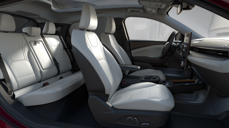 This 2025 Ford Mustang Mach-E comes equipped with, 10 Speakers, 1st & 2nd Row Floor Liners w/o Carpet Mats, 4-Wheel Disc Brakes, ABS brakes, Air Conditioning, Alloy wheels, AM/FM radio: SiriusXM with 360L, Apple CarPlay/Android Auto, Auto High-beam Headlights, Auto-dimming Rear-View mirror, Automatic temperature control, Brake assist, Bumpers: body-color, Cargo Area Cover, Cargo Floor Liner, Compass, Delay-off headlights, Driver door bin, Driver vanity mirror, Dual front impact airbags, Dual front side impact airbags, Electronic Stability Control, Emergency communication system: 911 Assist, Equipment Group 300A Standard Package, Exterior Parking Camera Rear, Four wheel independent suspension, Front anti-roll bar, Front Bucket Seats, Front Center Armrest, Front dual zone A/C, Front License Plate Bracket, Front reading lights, Fully automatic headlights, Garage door transmitter, Heated door mirrors, Heated front seats, Heated steering wheel, Heated/Ventilated Perforated ActiveX Bucket Seats, Illuminated entry, Interior Protection Package, Internet access capable: FordPass Connect, Knee airbag, Low tire pressure warning, Memory seat, Mobile Power Cord (120V/240V), Navigation system: Connected Navigation, Occupant sensing airbag, Outside temperature display, Overhead airbag, Overhead console, Panic alarm, Panoramic Fixed-Glass Roof, Passenger door bin, Passenger vanity mirror, Power door mirrors, Power driver seat, Power Liftgate, Power passenger seat, Power steering, Power windows, Radio data system, Radio: B&O Sound System by Bang & Olufsen, Rain sensing wipers, Rear anti-roll bar, Rear seat center armrest, Rear side impact airbag, Rear window defroster, Rear window wiper, Remote keyless entry, Security system, SiriusXM w/360L, Speed control, Speed-sensing steering, Speed-Sensitive Wipers, Split folding rear seat, Spoiler, Steering wheel mounted audio controls, SYNC 4A w/Enhanced Voice Recognition, Telescoping steering wheel, Tilt steering wheel, Tire Inflator & Sealant Kit, Traction control, Trip computer, Turn signal indicator mirrors, Variably intermittent wipers, Ventilated front seats, Wheels: 19 Bright Machined-Face Aluminum. Magenta 2025 Ford Mustang Mach-E Premium AWD Single-Speed Automatic Dual Electric Motor