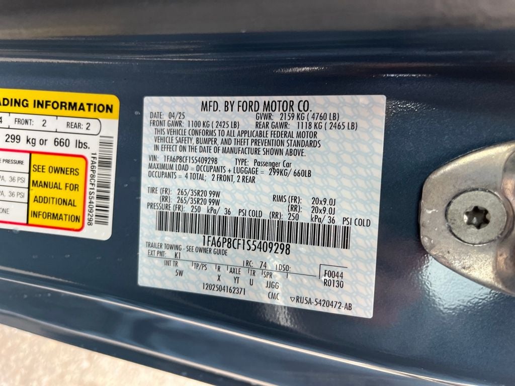 60th Anniversary Package, ABS brakes, Active Anti-Theft System, Anniversary Special Edition Badge, Auto High-beam Headlights, Brake assist, Brembo Brake System w/Performance Linings, Compass, Connected Navigation, Driver Seat & Mirrors Memory, Electronic Stability Control, Equipment Group 401A High Package, Ford Co-Pilot360 Assist+, Front dual zone A/C, Headlamps w/Black Bezels, Heated door mirrors, Heated front seats, Heated steering wheel, Illuminated Door-Sill Scuff Plates, Illuminated entry, Integrated Turn Signals, Leather-Trimmed Bucket Seats w/Color Accents, Locking Center Console, Low tire pressure warning, Painted High Gloss Black Honeycomb Grille, Pre-Collision Assist w/Automatic Emergency Braking, Rain sensing wipers, Rear Parking Sensors, Remote keyless entry, Security Package, Silver Painted Mirror Caps, Traction control, Wheels: 20 x 9 Bright Machined Aluminum. Vapor Blue Metallic 2025 Ford Mustang GT Premium RWD 10-Speed Automatic 5.0L V8 Ti-VCT