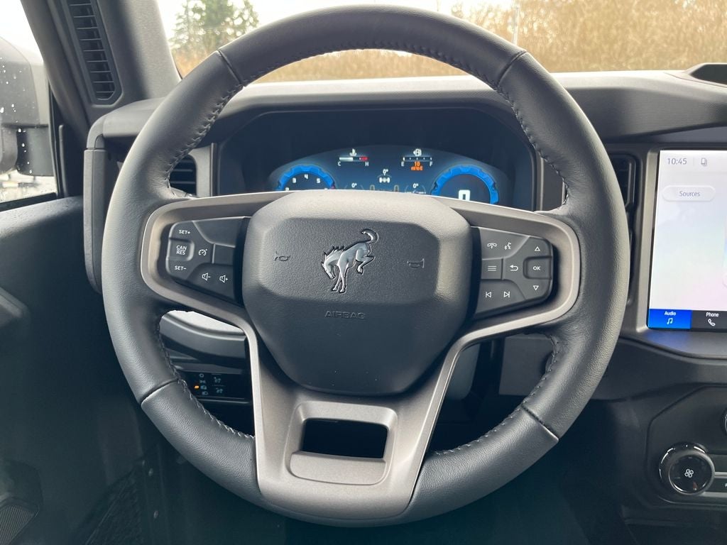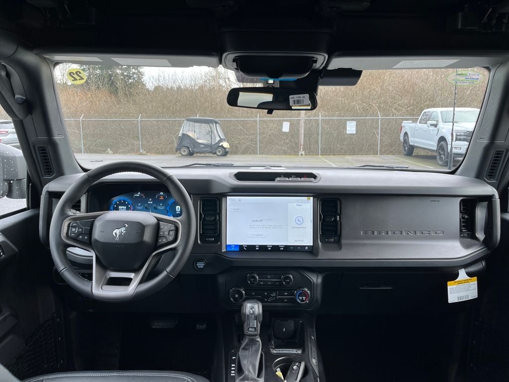 This 2026 Ford Bronco comes equipped with, 4-Wheel Disc Brakes, 4.46 Axle Ratio, 7 Speakers, ABS brakes, Air Conditioning, Alloy wheels, AM/FM radio: SiriusXM with 360L, AM/FM Stereo, Auto High-beam Headlights, Brake assist, Cloth Bucket Seats, Compass, Delay-off headlights, Driver door bin, Driver vanity mirror, Dual front impact airbags, Dual front side impact airbags, Electronic Stability Control, Emergency communication system: 911 Assist, Exterior Parking Camera Rear, Ford Connectivity Package (1-Year Included), Front anti-roll bar, Front Bucket Seats, Front Center Armrest, Front reading lights, Front wheel independent suspension, Fully automatic headlights, Heated door mirrors, Illuminated entry, Integrated roll-over protection, Low tire pressure warning, Occupant sensing airbag, Outside temperature display, Overhead airbag, Overhead console, Panic alarm, Passenger door bin, Passenger vanity mirror, Power door mirrors, Power steering, Power windows, Radio data system, Remote keyless entry, Security system, SiriusXM with 360L, Speed control, Split folding rear seat, Steering wheel mounted audio controls, SYNC 4, Tachometer, Telescoping steering wheel, Tilt steering wheel, Traction control, Trip computer, Variably intermittent wipers, Wheels: 17 Carbonized Gray-Painted Aluminum. 2026 Ford Bronco Big Bend 4WD 2.3L EcoBoost I-4