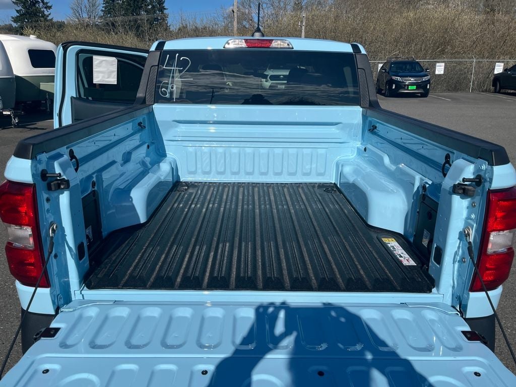 This 2026 Ford Maverick comes equipped with, 2.5L I-4 Hybrid, 2.91 Axle Ratio, Equipment Group 301A, Ford Connectivity Package (1-Year Included), Radio: AM/FM Stereo with 6 Speakers, SiriusXM with 360L, SYNC 4 with Enhanced Voice Recognition, Unique Cloth Front Bucket Seats, Wheels: 17 Carbonized Gray Painted Aluminum, 4-Wheel Disc Brakes, 4K Tow Package, 6 Speakers, ABS brakes, Air Conditioning, Alloy wheels, AM/FM radio: SiriusXM with 360L, Apple CarPlay/Android Auto, Auto High Beams, Auto High-beam Headlights, Automatic temperature control, BLIS with Cross-Traffic Alert and Trailer Coverage, Brake assist, Bumpers: body-color, Compass, Delay-off headlights, Driver door bin, Driver vanity mirror, Dual front impact airbags, Dual front side impact airbags, Electronic Stability Control, Emergency communication system: SYNC 4 911 Assist, Exit Warning, Exterior Parking Camera Rear, Ford Co-Pilot360, Four wheel independent suspension, Front anti-roll bar, Front Bucket Seats, Front Center Armrest, Front reading lights, Fully automatic headlights, Illuminated entry, Internet access capable: 5G Modem - Ford Connectivity Package, Intersection Assist, Knee airbag, Lane-Keeping System, Low tire pressure warning, Occupant sensing airbag, Outside temperature display, Overhead airbag, Overhead console, Panic alarm, Passenger door bin, Passenger vanity mirror, Power door mirrors, Power Glass Manual-Folding Mirrors, Power steering, Power windows, Pre-Collision Assist with Automatic Emergency Braking, Radio data system, Rear anti-roll bar, Rear Cross Traffic Braking, Rear Parking Sensors, Rear seat center armrest, Rear step bumper, Rear-View Camera, Remote keyless entry, Security system, Speed control, Speed-sensing steering, Steering wheel mounted audio controls, Telescoping steering wheel, Tilt steering wheel, Traction control, Trailer Brake Controller, Trailer Hitch (class III) 2 Receiver, Trip computer, Upgraded Cooling Fan, 2.5L I-4 Hybrid, 2.91 Axle Ratio, Equipment Group 301A, Ford Connectivity Package (1-Year Included), Radio: AM/FM Stereo with 6 Speakers, SiriusXM with 360L, SYNC 4 with Enhanced Voice Recognition, Unique Cloth Front Bucket Seats, Wheels: 17 Carbonized Gray Painted Aluminum. Light Blue 2026 Ford Maverick XLT AWD CVT 2.5L I-4 Hybrid
