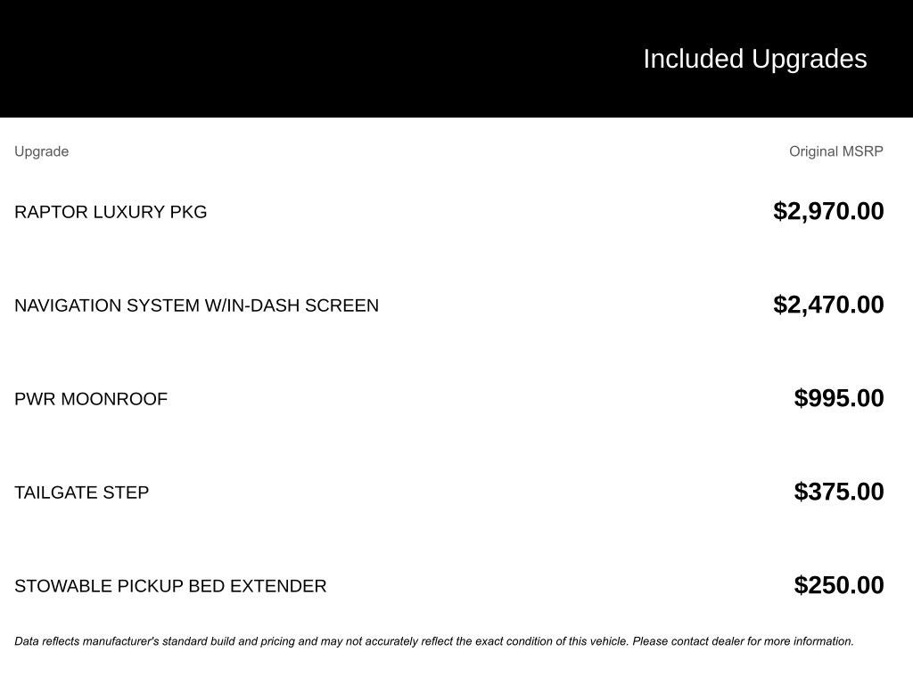 - RAPTOR LUXURY PKG: Includes heated/cooled 10-way power driver/front passenger seats with memory, dual-zone electronic automatic temperature control, Sony audio system with in-dash CD/MP3 changer, power-folding heated side mirrors, power-adjustable pedals with memory, and more.