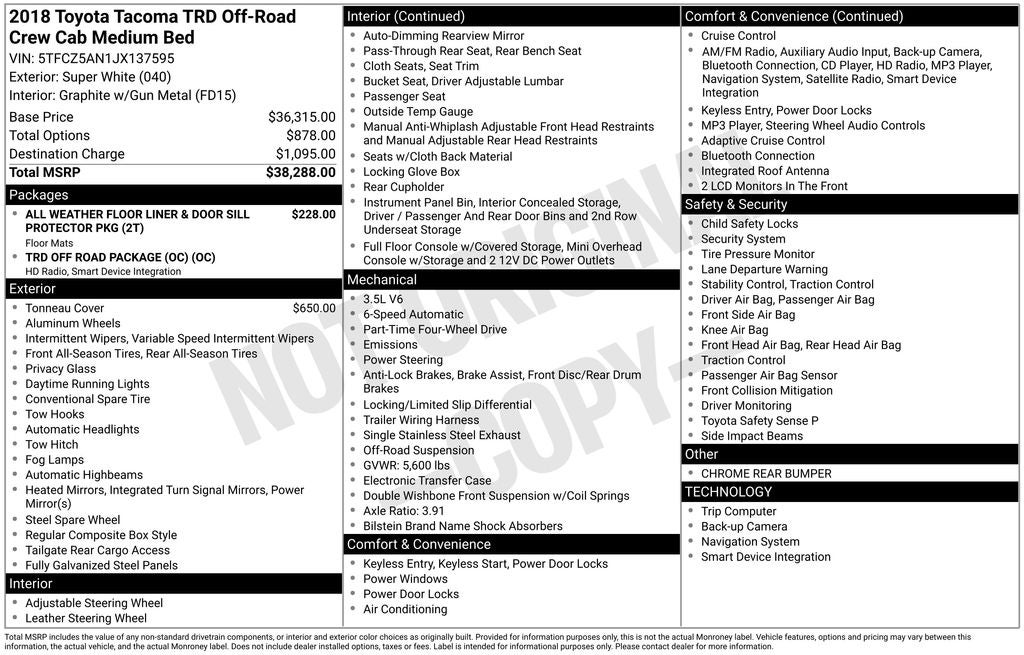 2018 Toyota Tacoma SR5 V6 4WD 3.5L V6 PDI DOHC 24V LEV3-ULEV70 278hp 6-Speed Automatic