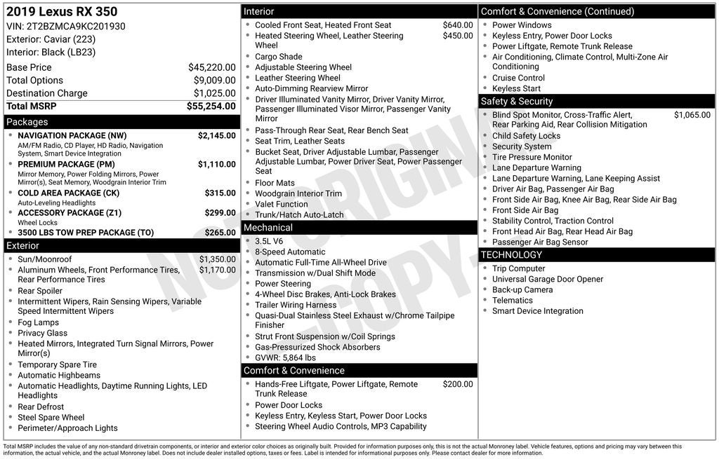Whether you're commuting, running errands, or embarking on a road trip, this 2019 Lexus RX 350 is the perfect companion. With its exceptional blend of luxury, performance, and technology, it's sure to exceed your expectations. We invite you to schedule a test drive and experience the difference for yourself.