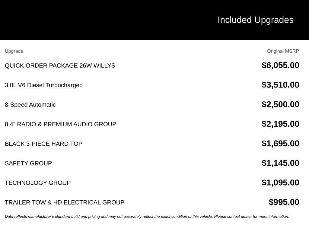 The Willys package further enhances the Wrangler's off-road prowess, with features like a black grille, Willys hood decal, and rock protection sill rails. The custom wheels and lift kit give this Wrangler an aggressive, adventurous stance that's sure to turn heads on the trail or the road.