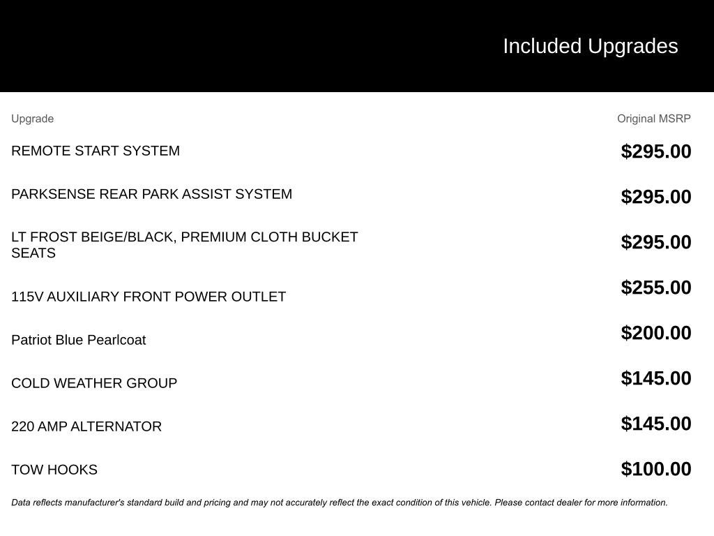 The exterior of this Big Horn model boasts a stylish Blue paint color, complemented by the 18-inch polished aluminum wheels and chrome accents. The interior features premium cloth bucket seats, a leather-wrapped steering wheel, and a state-of-the-art Uconnect 5 infotainment system with an 8.4-inch display, navigation, and SiriusXM satellite radio.