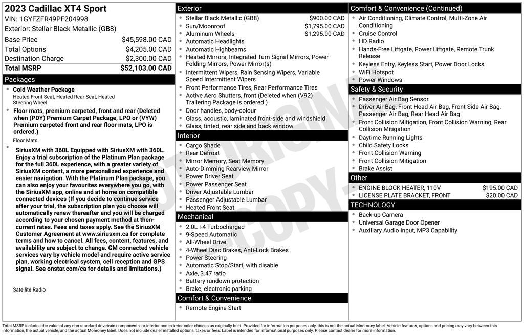 This XT4 Sport is equipped with a powerful 2.0L I4 Turbocharged engine, delivering an impressive 22 city / 29 highway MPG. The 9-Speed Automatic transmission and All-Wheel Drive system provide a seamless and responsive driving experience, making this Cadillac a joy to pilot through city streets or open highways.
