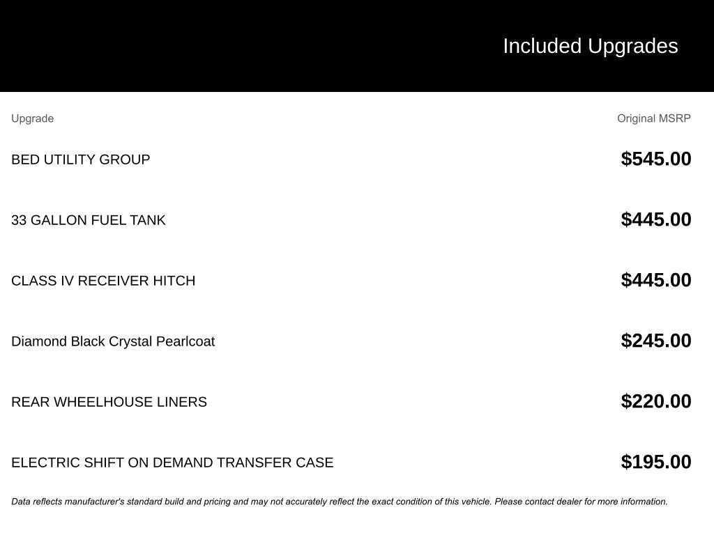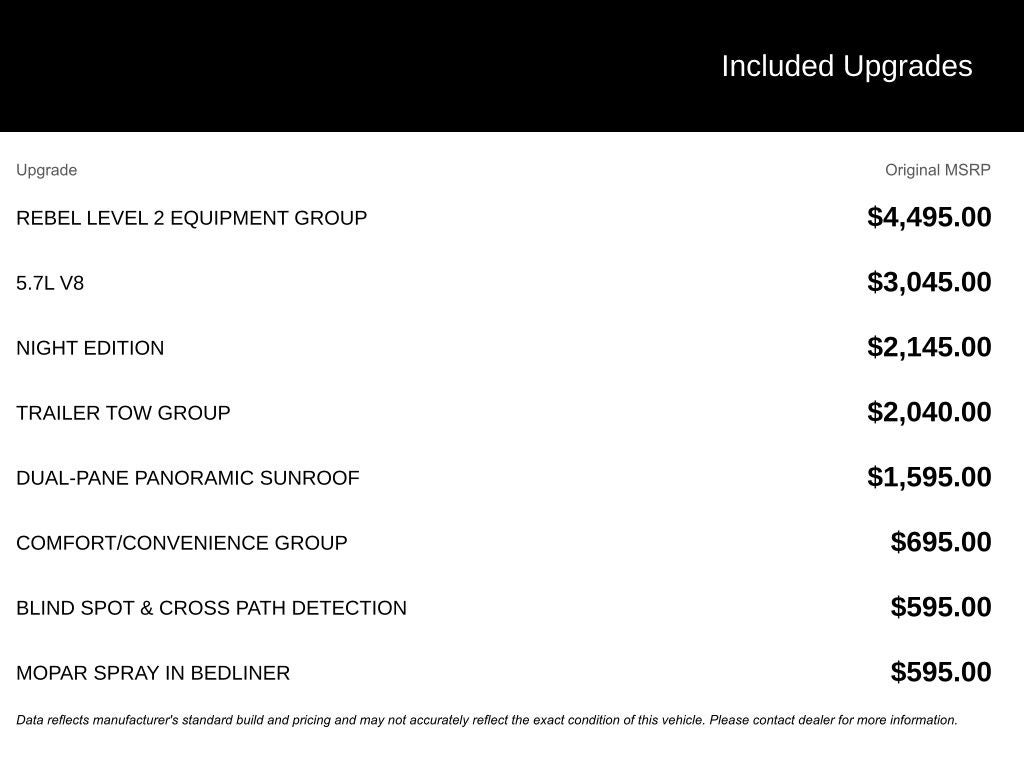 With its advanced 4x4 system, the Rebel is ready to tackle any terrain with confidence. The Trailer Tow Group and Class IV receiver hitch make this truck an exceptional choice for those with active lifestyles, whether you're hauling your boat to the lake or your toys to the trail. And with the Bed Utility Group, you'll have the perfect tools to keep your cargo secure and organized.