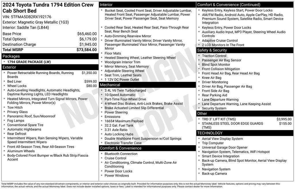 Elevating the driving experience, this Tundra is equipped with a TRD 3 Lift Kit, Power Running Boards, a Non-Skid Spray-On Bed Liner, and Stainless Steel Door Edge Guards. The 1794 Grade Package and TRD Off-Road Package further enhance its capabilities, ensuring you can tackle any terrain with confidence.