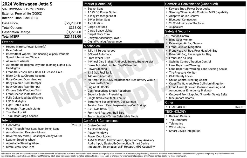 This 2024 Volkswagen Jetta 1.5T S is a remarkable blend of performance, technology, and style. We invite you to experience the difference for yourself. Visit our showroom today and let our knowledgeable team guide you through a test drive. We're confident you'll be impressed by this exceptional vehicle.